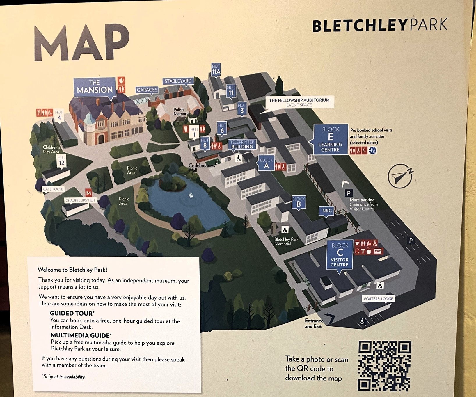 Bletchley Park spans approximately 58 acres (about 23 hectares) and includes many buildings and huts, the location of which can be seen on a map displayed at the site.
