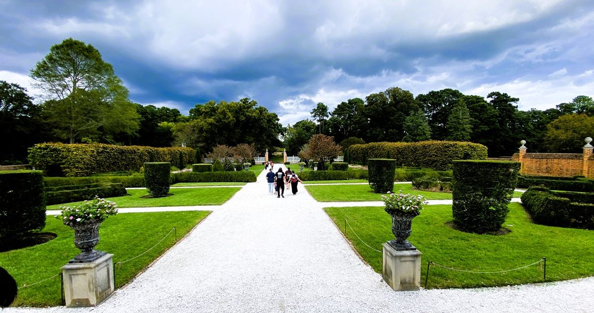 Originally inspired by Baroque and Renaissance models, the current gardens were recreated based on archaeological evidence and period descriptions. The gardens were designed to featured geometric patterns, straight paths, and carefully clipped hedges. Broad gravel walks and terraces allowed promenades, where guests could admire the grounds and socialise in a setting of cultivated elegance. Imported flowers, shrubs, and fruit trees were arranged in decorative beds. Boxwood hedges and topiary added structure and visual drama. All of which was designed to reflect European fashion.