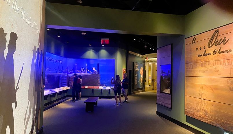 The 22,000 square feet of permanent galleries within the museum showcase rare artifacts, dioramas, and interactive displays and includes over 1,300 artifacts. It includes a film “Liberty Fever” which sets the stage for the museum experience. The indoor galleries at the museum offer an immersive, artifact-rich journey through the Revolutionary era, blending traditional displays with cutting-edge multimedia and inclusive storytelling.