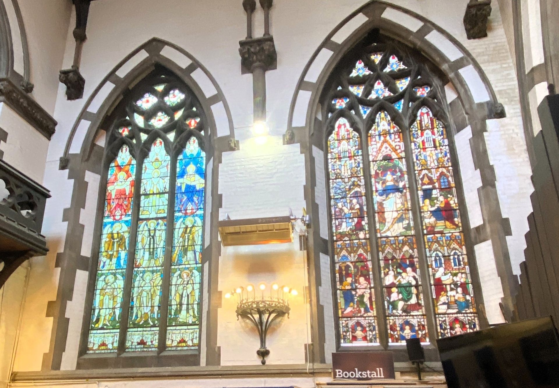 The stained-glass windows of the church are understated yet historically rich, quietly illuminating the church’s Victorian Gothic heritage even as its worship style has evolved. The east window and north-east transept windows are attributed to Clayton and Bell, one of the most prolific stained glass studios of the 19th century. Their work is known for vivid colours, flowing Gothic tracery, and biblical storytelling which feature scenes from the life of Christ, angels, saints, and symbolic motifs like lilies, vines, and crosses. Rich jewel tones - especially reds, blues, and golds – are set within Gothic frames.