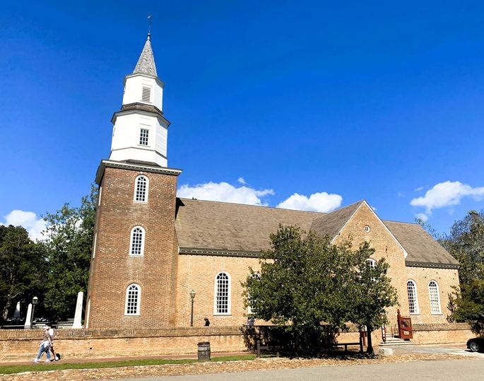 One of the buildings located towards the west end of the Duke of Gloucester Street is the Bruton Parish Church. This was built between 1711 and 1715 replacing an earlier wooden structure and is a Georgian-style Episcopal church that served as the spiritual and civic heart of colonial Williamsburg. Established in 1674, it became the official church of Virginia’s capital, used by prominent figures like George Washington, Thomas Jefferson, and Patrick Henry. Its cruciform brick structure, box pews, and communion silver donated by Queen Anne reflect both architectural refinement and royal patronage. Still an active congregation today, the church embodies centuries of worship, civic unity, and revolutionary transformation.