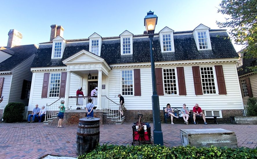 Immediately across the street is the Raleigh Tavern. Established around 1717, the Raleigh Tavern was one of the largest and most respected taverns in colonial Virginia. Named after Sir Walter Raleigh, the original structure was destroyed by fire in 1859, but it was reconstructed in 1930–31 as the first building restored in Colonial Williamsburg. The building features Colonial Revival architecture, with a symmetrical façade, gabled roof, and central entrance flanked by sash windows.