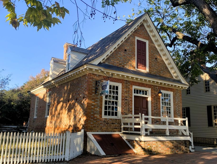 Next to that is the Prentis Store. Built between 1738 and 1740 by merchant William Prentis, it is Colonial Williamsburg’s oldest surviving commercial building and a rare example of refined colonial retail architecture. The Prentis Store is notable for its architectural elaboration, rare among colonial commercial buildings. It has a pedimented roof facing the street with a modillion cornice, and trussed framing. Trussed roof structure, unusual for a building of its size, and pronounced kicked eaves, add visual interest to the roofline. The building was restored in 1929, with further work in 1972 to return the entrance to its original height.