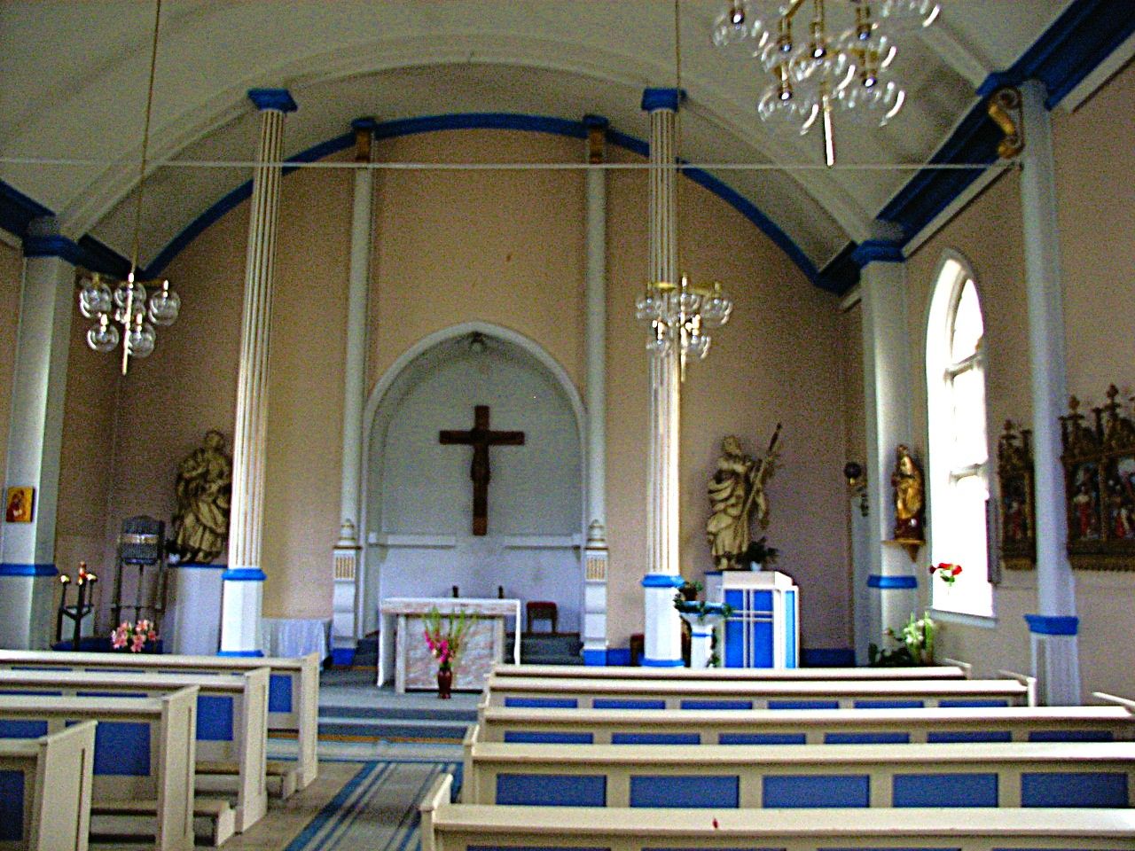 The interior has a single nave with a simple wooden ceiling and wooden pews arranged in a straightforward layout with seating for about 150 people. Minimalist, with little ornamentation it is bright, painted in light colours having been modified several times, most significantly in the 1970s, when Bishop Gerhard Goebel directed a major simplification.