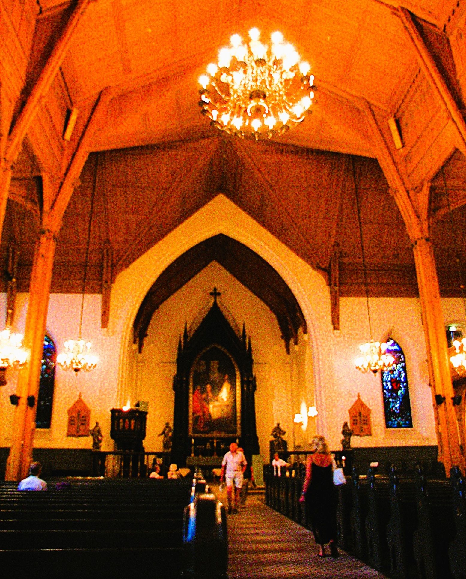 The altar features a tall Gothic frame and the painting commissioned specifically for the new cathedral to replace the artwork lost in the 1880 fire. Entitled The Resurrection of Christ by Eilif Peterssen (1852–1928) one of Norway’s leading painters of the late 19th century, known for his luminous, dramatic religious works.