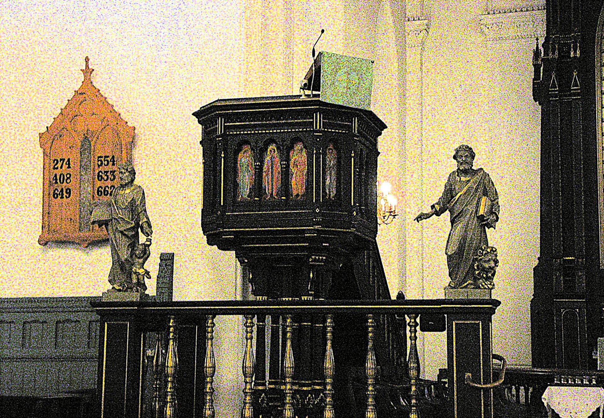 On the north side of the chancel, slightly forward of the altar and elevated for acoustics and visibility, is the pulpit. The Neo Gothic wooden structure does not contain any statues, although statues of the four Evangelist (Matthew, Mark, Luke, John), carved by Michael Røyel around 1750, are close to it. It does contains 12 small paintings of the apostles which were painted by Hugo Lous Mohr (1889–1970) for the cathedral’s 50 year anniversary.