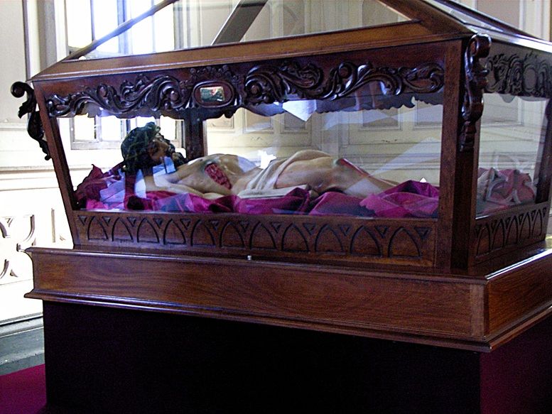 These figures are traditionally kept in glass coffins or vitrines because they are used in Holy Week processions, especially Good Friday. They are considered highly sacred devotional images.