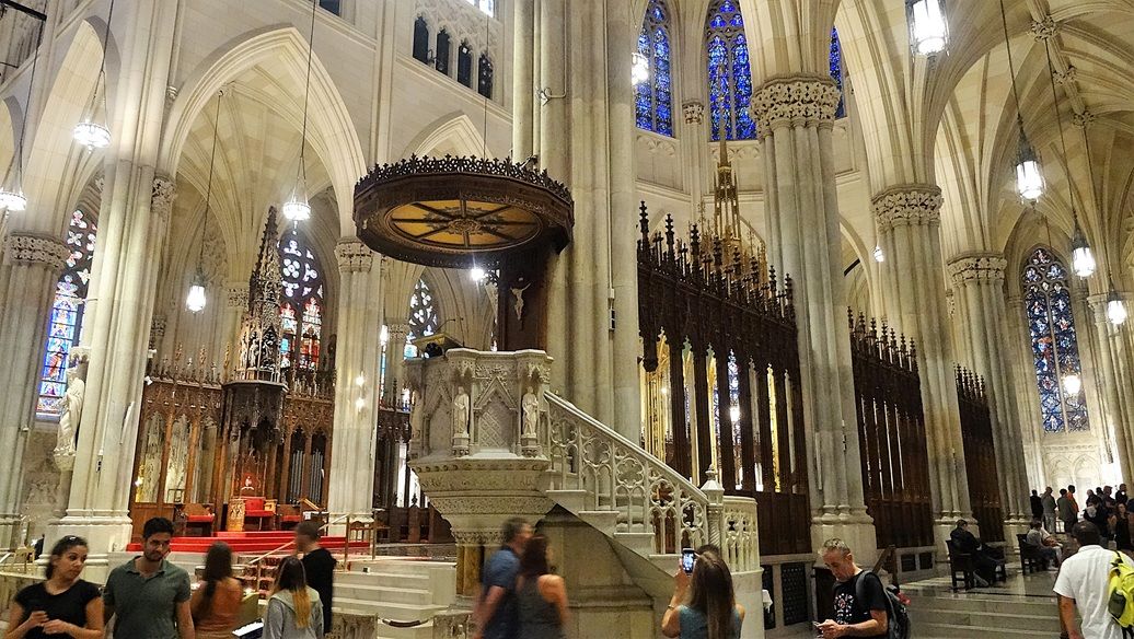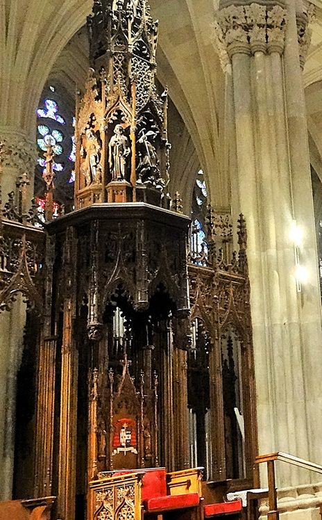 Standing opposite the pulpit, is the Bishop’s Chair, also called the cathedra. This is positioned so the archbishop can preside over major liturgies. It is the ceremonial seat of the Archbishop of New York and the defining feature that makes St. Patrick’s a cathedral rather than simply a large church.