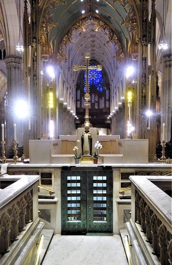 Beneath the main altar is “the crypt” or “the burial vault” which is not open to the public. It contains the tombs of the Archbishops of New York. Its entrance is a small, unobtrusive doorway located in the sanctuary area, leading down to the burial vault its design intentionally avoids drawing attention, reflecting the humility and solemnity of the space below. The entrance is positioned near the high altar, on the south side of the sanctuary. The simple, stone-framed recessed doorway is modest, and integrated into the sanctuary architecture so that it does not interrupt the visual flow of the Gothic design. Only clergy, cathedral staff, and those involved in funeral rites for an archbishop enter the crypt.