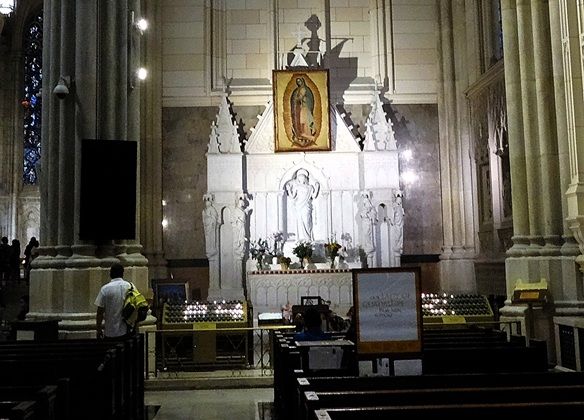 Also located along the north aisle is the Our Lady of Guadalupe Chapel, one of St. Patrick’s most beloved side chapels, dedicated to Mary as she appeared in Mexico in 1531. The chapel centres on a prominent image of Our Lady of Guadalupe, surrounded by candles and often adorned with flowers, creating a warm, intimate atmosphere distinct from the cathedral’s soaring marble interior.
