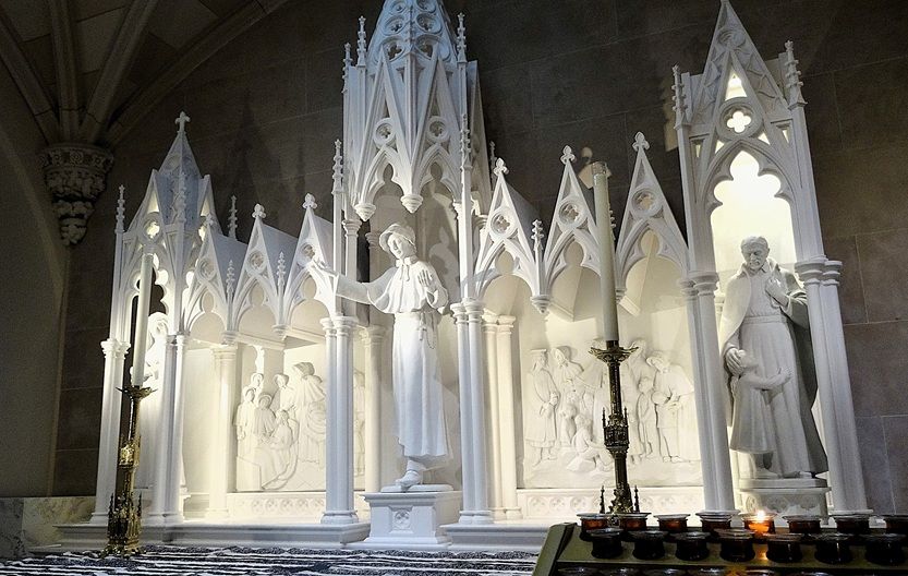 On entry the interior features a long, rib-vaulted nave lined with marble columns and pointed arches, illuminated by stained-glass windows crafted in Europe. The nave leads toward the sanctuary and high altar, which is elevated and framed by Gothic arches. It is one of the largest Catholic naves in North America. The nave’s height and stone surfaces create rich, resonant acoustics, ideal for choral music and organ performances.