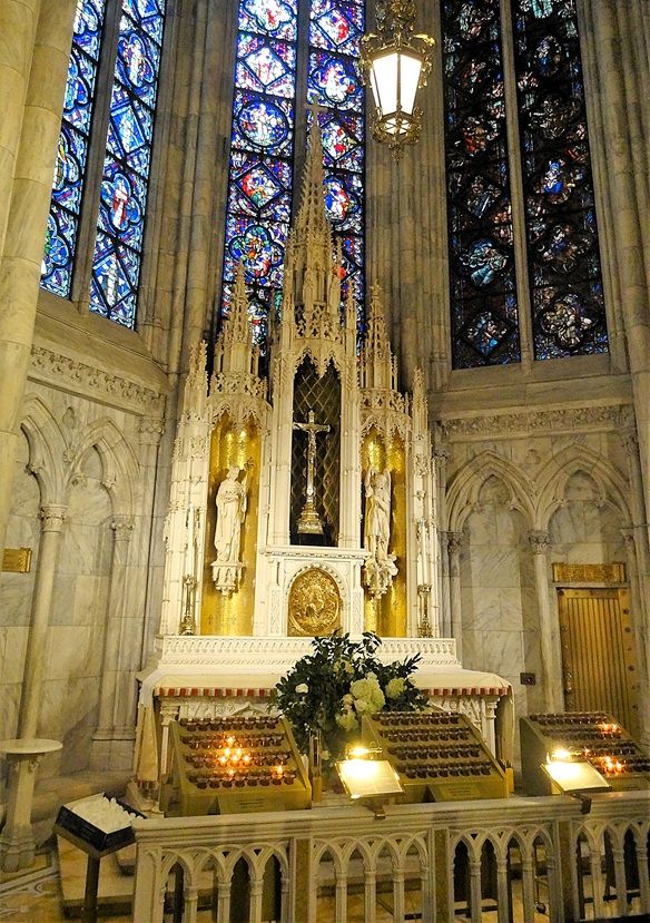 During the late 1930’s and early 1940’s the High Altar area underwent renovation, and it was at this time that the High Altar was replaced, and a bronze baldachin and rose stained-glass window were added. The High Altar was designed by Maginnis & Walsh, leading American ecclesiastical architects, and is a monumental Gothic Revival marble altar crowned by the bronze baldachin that was installed in 1942. This replaced the original 19th‑century altar to better harmonise with the cathedral’s architecture. The original High Altar installed in 1879, was grand but stylistically mismatched - its proportions and reredos did not integrate well with the cathedral’s Gothic interior. By the late 1930s, Cardinal Spellman commissioned a redesign to bring the sanctuary into harmony with the building’s architecture. The original altar was moved to Fordham University’s church, where it still stands. The present altar remains one of the most visually commanding liturgical structures in any American cathedral.
