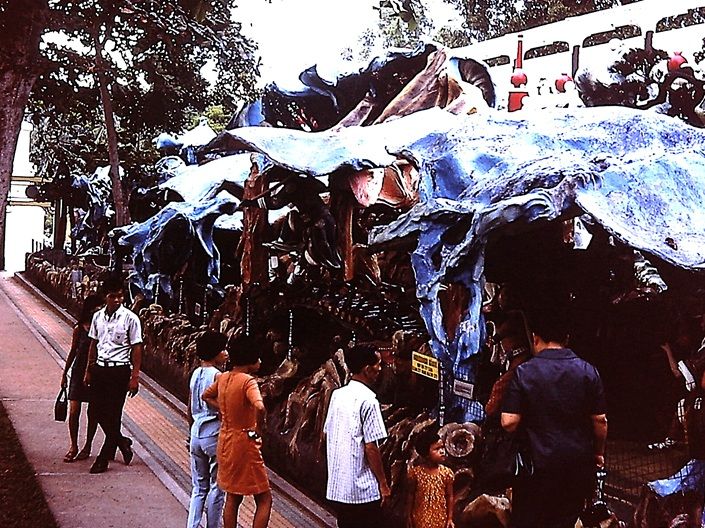 Haw Par Villa is filled with hundreds of statues and dioramas. A diorama is a three dimensional scene—small or life size—that recreates a moment or story using figures, objects, and a painted background to make the display feel real. Many of these scenes show famous stories from Chinese literature, such as Journey to the West, Madam White Snake, and the well known Ten Courts of Hell, which illustrates the results of good and bad behaviour. Most of the sculptures were made in the 1930s to 1950s using concrete and plaster, and they have changed very little since then. Their bright colours, dramatic poses, and bold storytelling still give the park its unique and unforgettable style.