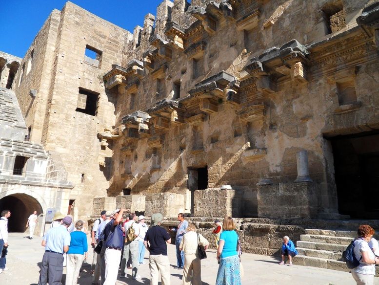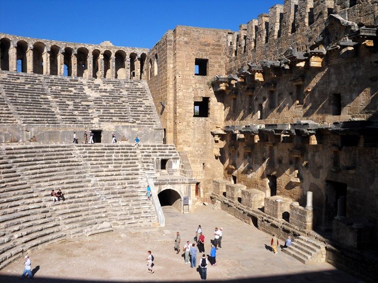 Most Roman theatres lost their stage walls (The Scaenae Frons), Aspendos’s is still fully intact and is Multi‑storey façade rises nearly 30 metres, giving a complete view of a Roman theatre.