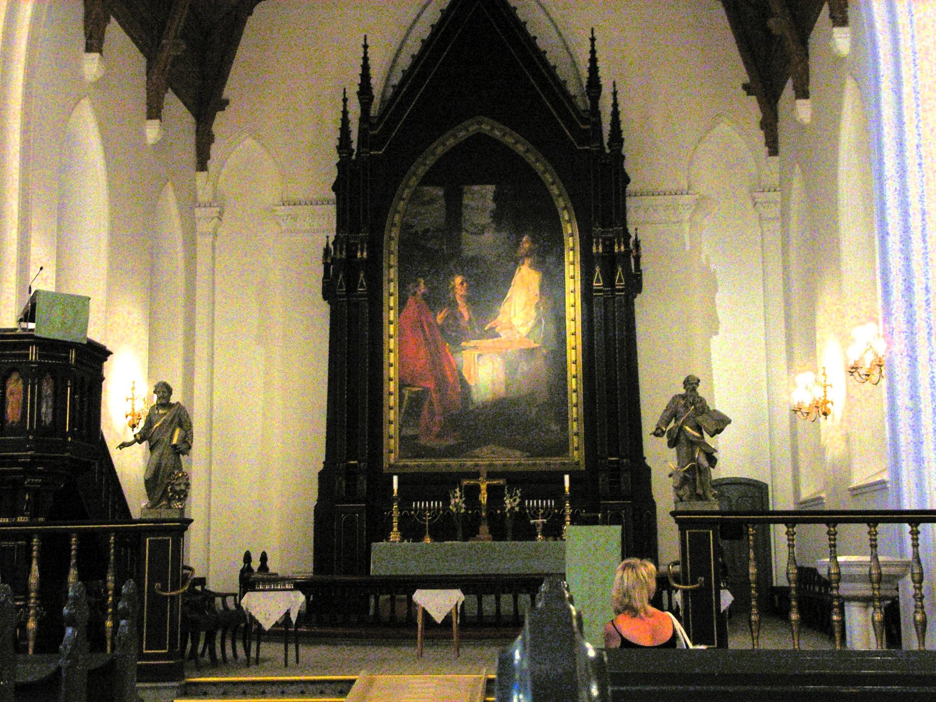 The altar features a tall Gothic frame and the painting commissioned specifically for the new cathedral to replace the artwork lost in the 1880 fire. Entitled The Resurrection of Christ by Eilif Peterssen (1852–1928) one of Norway’s leading painters of the late 19th century, known for his luminous, dramatic religious works.