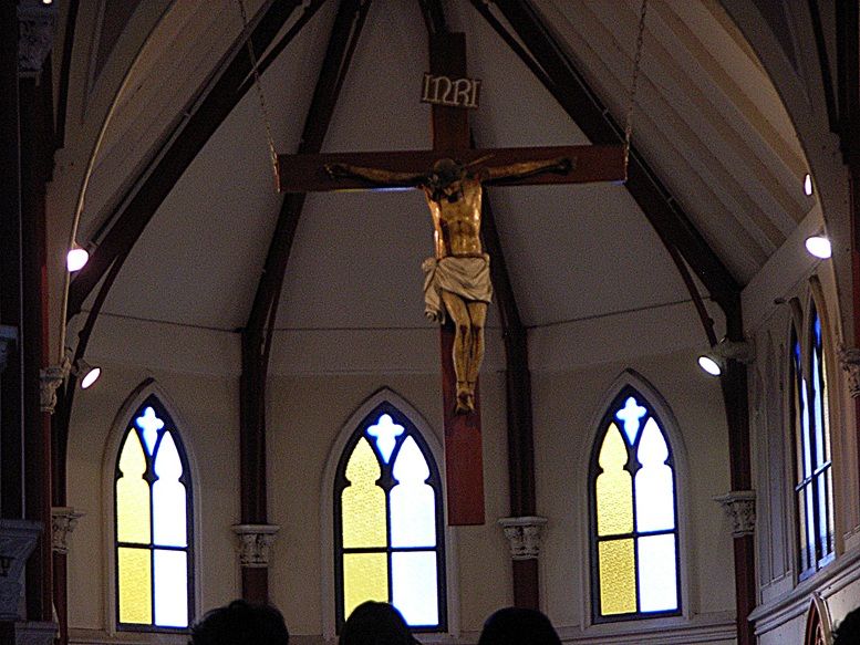 At the far end is a raised sanctuary with a simple altar with a carved wooden crucifix with the painted figure of Christ with outstretched arms.