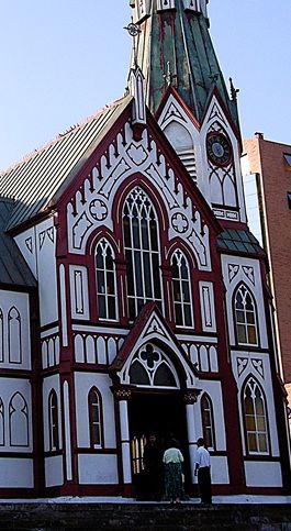St. Mark’s Cathedral, with its striking red‑and‑white Gothic Revival façade, is one of the most distinctive churches in South America.