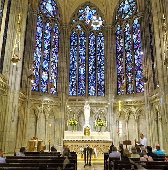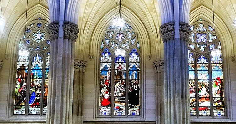 The windows illustrate scenes from the life of Christ, the Virgin Mary and the saints. They also include Old Testament narratives and historical figures connected to the cathedral’s construction, such as the architect James Renwick Jr. presenting plans to Archbishop Hughes.